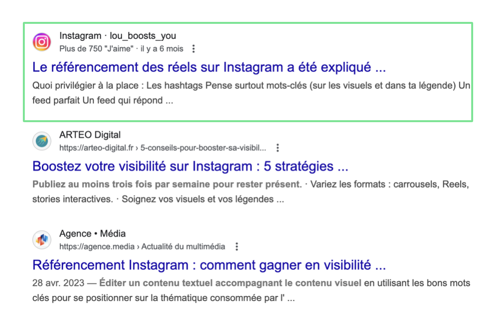 Mais cette opportunité ne se saisit pas automatiquement. Pour transformer chaque publication en levier SEO, il faut penser vos posts comme de véritables pages web : une légende claire et optimisée, un alt text précis, quelques hashtags ciblés, une bio optimisée et une géolocalisation bien choisie. Et surtout, ne pas négliger les Reels, qui apparaissent directement dans Google et offrent aujourd’hui l’un des formats les plus puissants pour la visibilité.